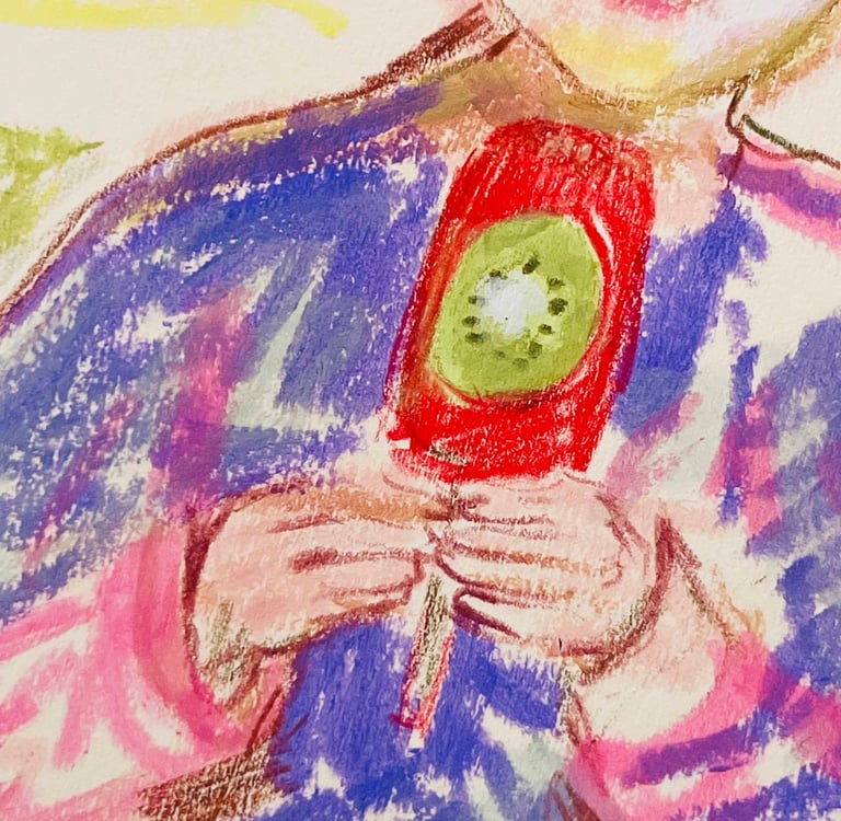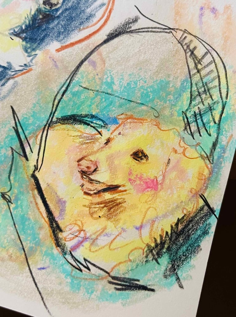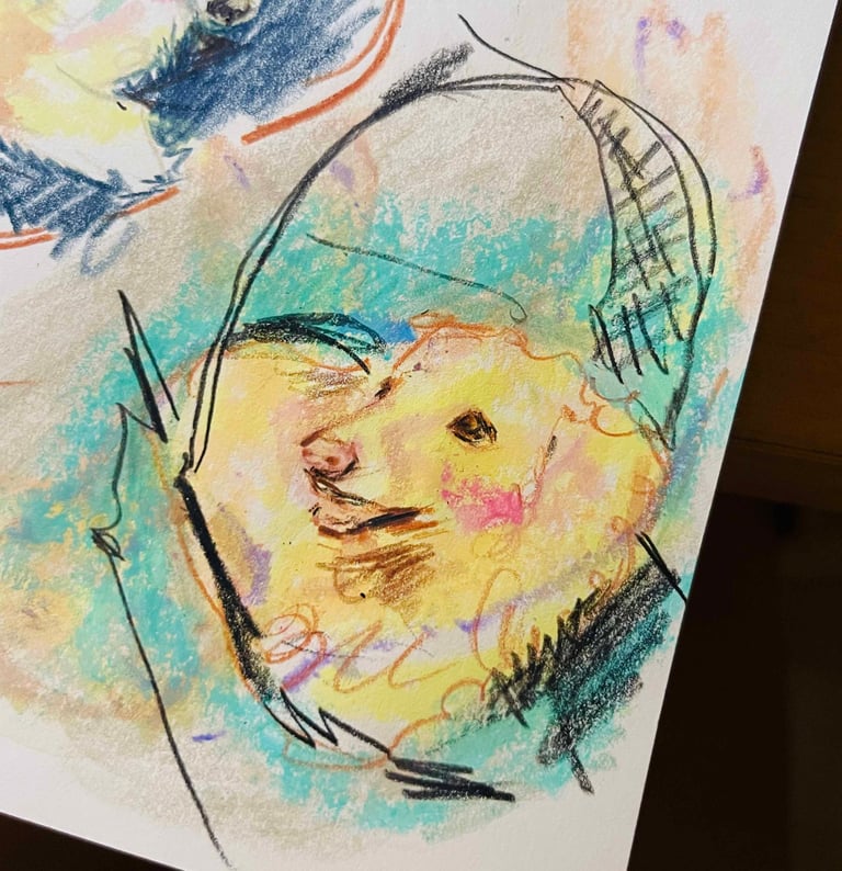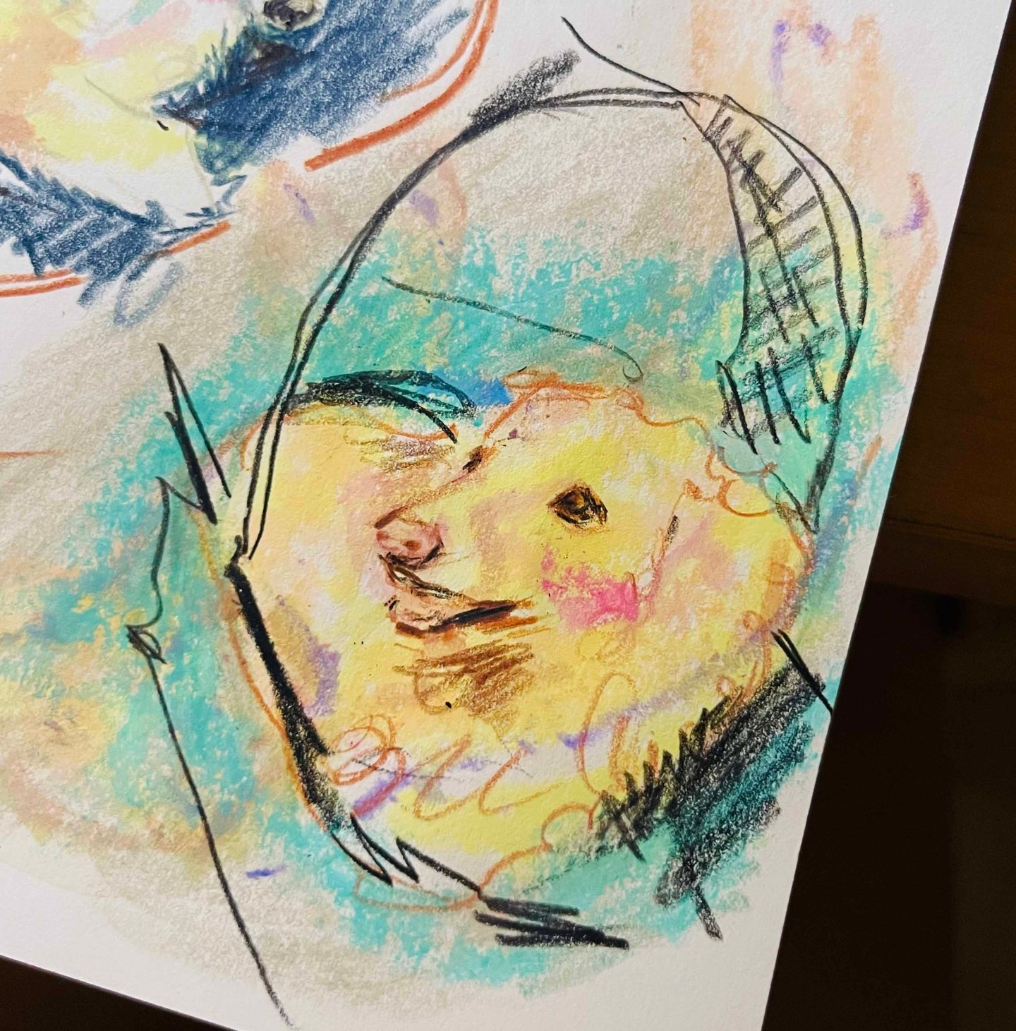 And I also captured the essence of my lovely puppy, employing a vibrant lemon yellow paint stick to outline her tiny shape, and then detailed her features with Derwent Drawing pencils, adding depth and character to her form. The gentle pink on her cheeks has become my favorite symbol within this piece, radiating warmth and affection. This drawing serves as a cherished reminder of the joy and love my puppy brings into my life, encapsulating the little moments that make our time together so special.