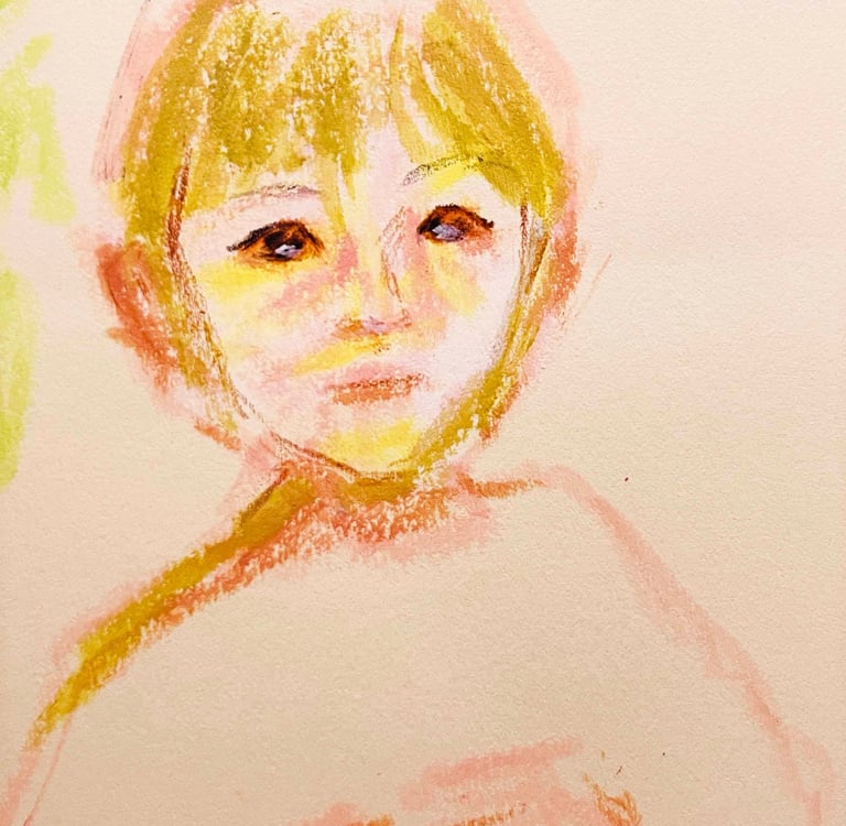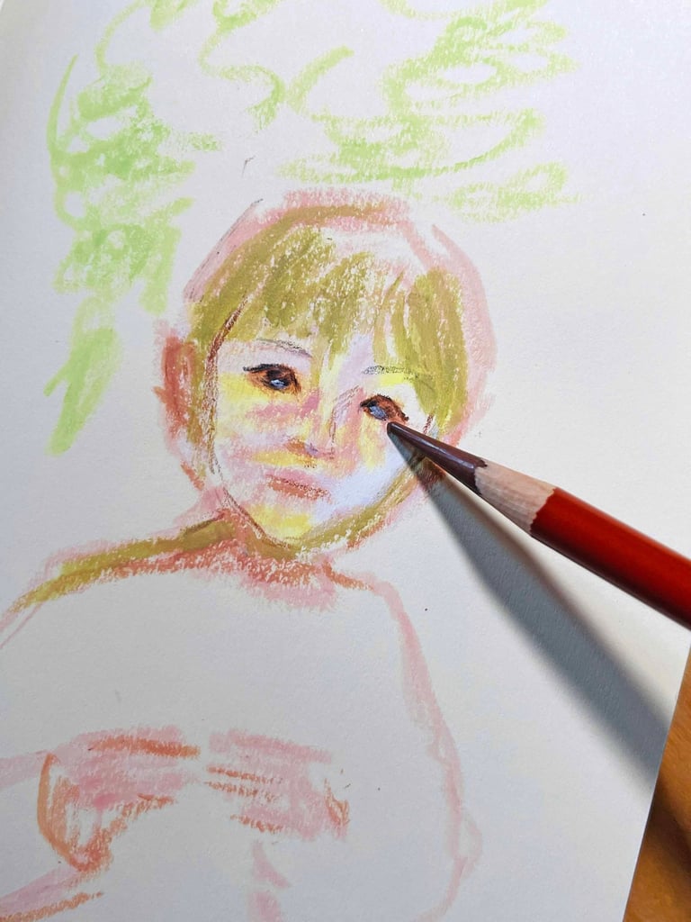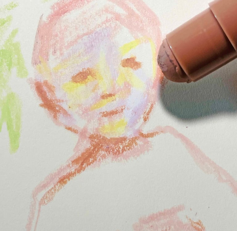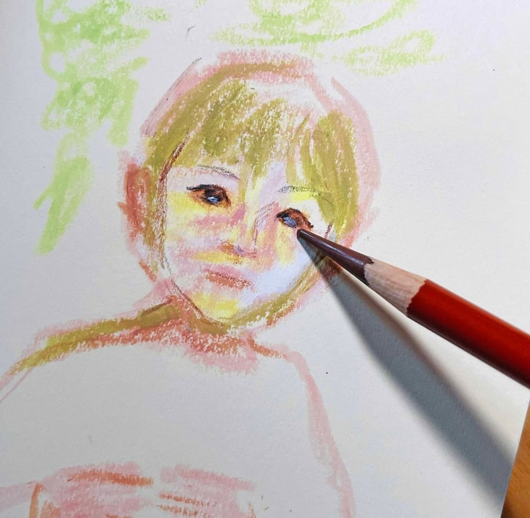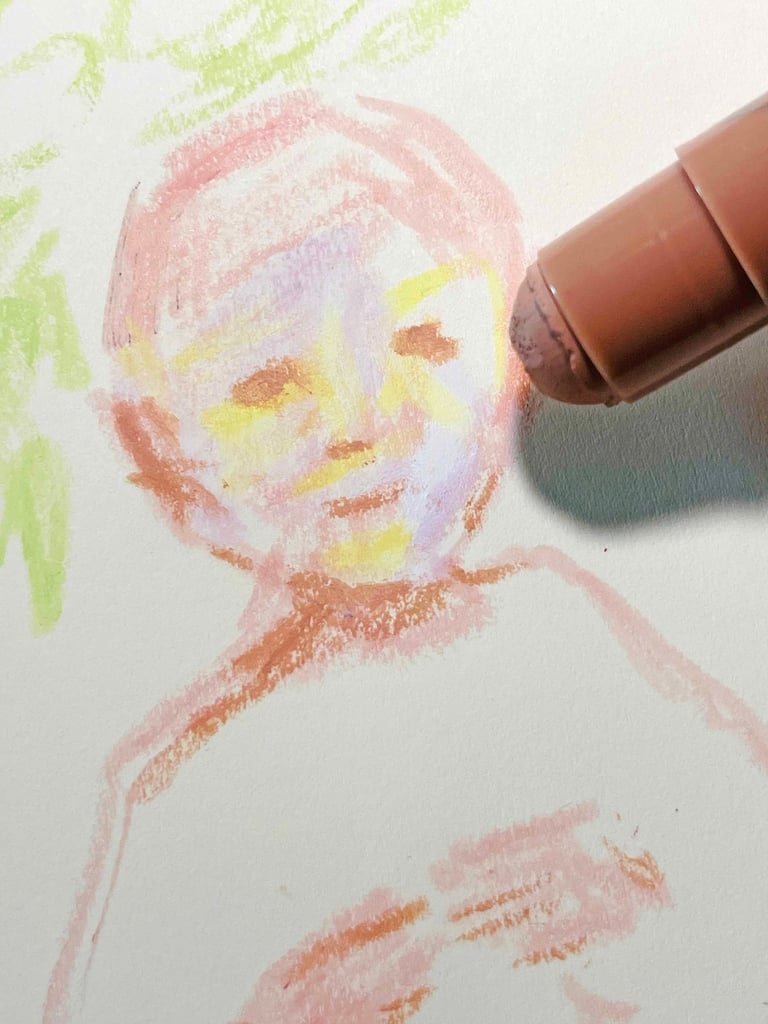 In my process, I began by using soft pink paint sticks to capture the rough outline of the little girl's form, allowing her essence to emerge on the paper. This initial layer of color provided a tender foundation, and to enhance her features and bring greater depth to her portrayal, I then applied a skin tone that complemented the soft pink, adding value to her face.