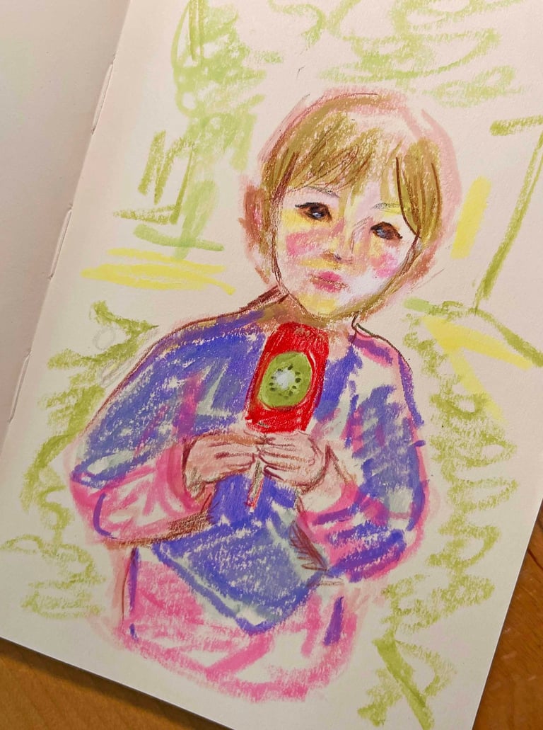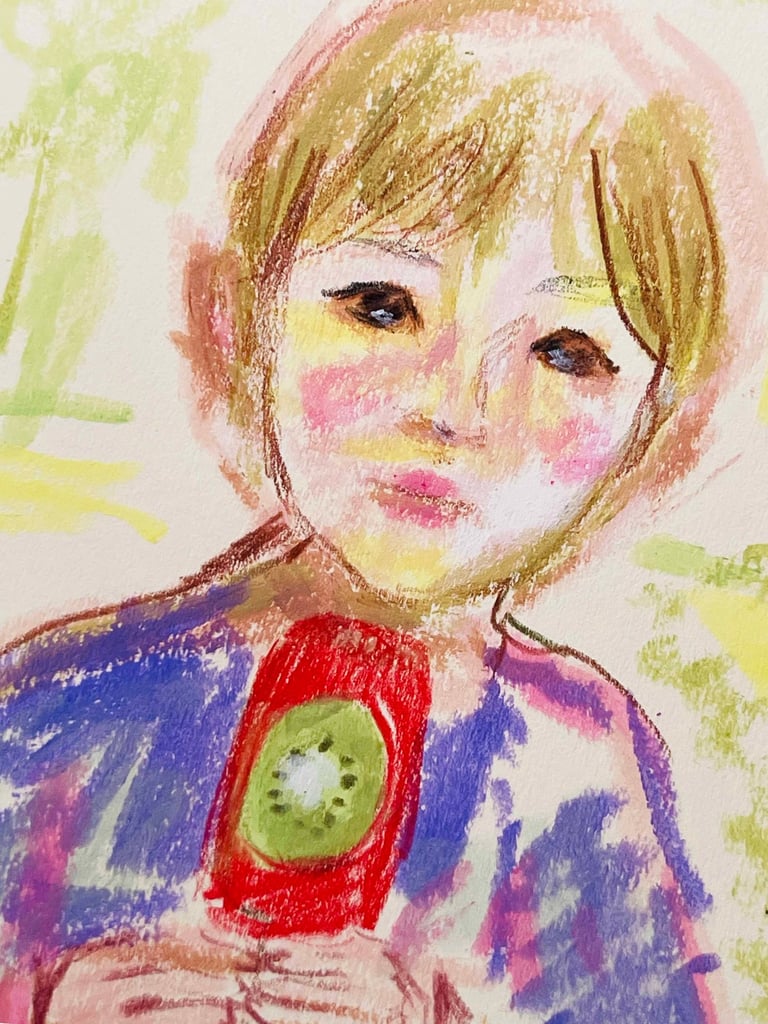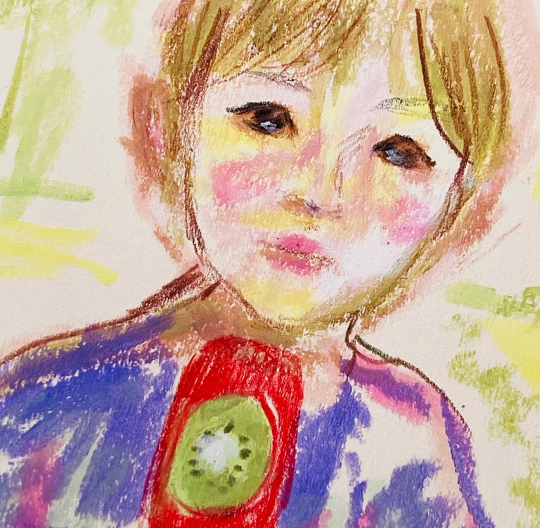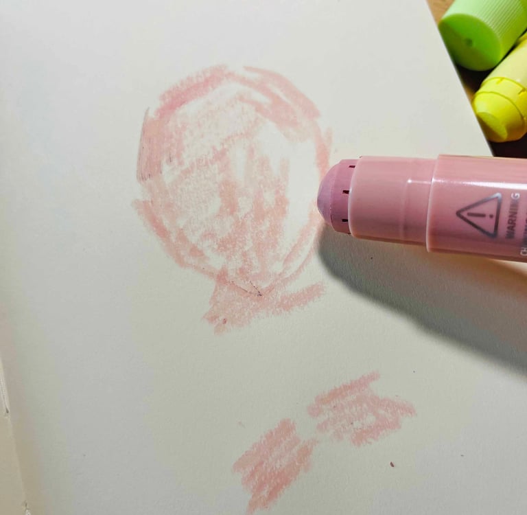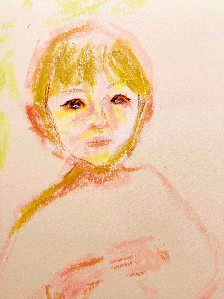 In my process, I began by using soft pink paint sticks to capture the rough outline of the little girl's form, allowing her essence to emerge on the paper. This initial layer of color provided a tender foundation, and to enhance her features and bring greater depth to her portrayal, I then applied a skin tone that complemented the soft pink, adding value to her face.