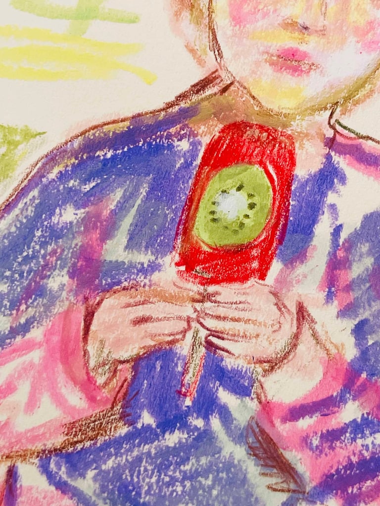 The vibrant popsicle in her hand, a delightful fusion of kiwi and watermelon flavors, catches the eye with its bright green and pink hues, providing a cool contrast to the summer sun. The popsicle not only enhances her playful demeanor but also evokes nostalgic memories of childhood summers spent savoring similar frozen delights. Each bite brings a playful fun to the moment, making it all the more special.