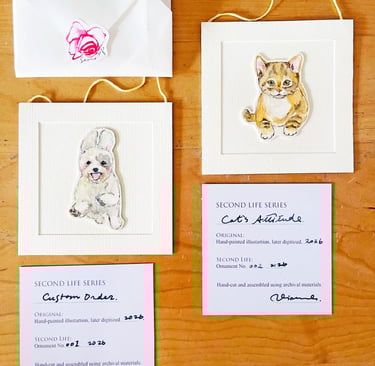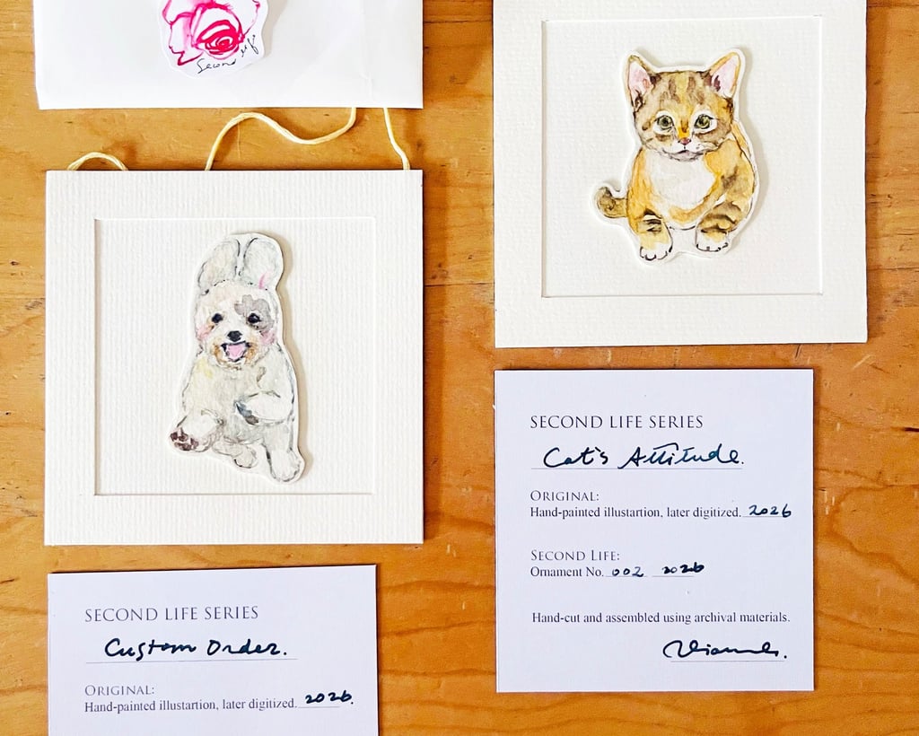 The small info card you receive is not just a label—it’s a record. It tells you where the piece began (“hand-painted illustration, later digitized”) and what it has become (“hand-cut and assembled using archival materials”). Each ornament is numbered, quietly marking its place within the series. Nothing is mass-produced, so every piece is slightly different, please be aware of that. When you hold one of these pieces, you can feel that's only been created for you.